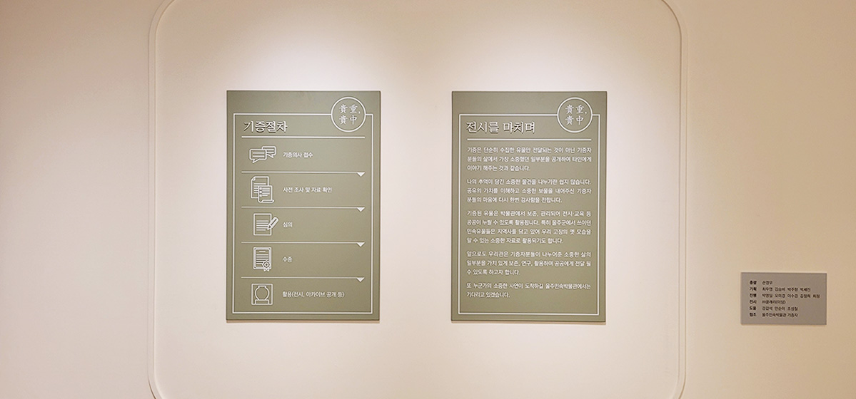 기획전시실은 울주민속박물관, 울주 지역의 전통민속문화와 관련하여 다양한 전시를 감상하실 수 있는 곳입니다. 비록 공간의 크기는 작지만 이로 인해 더욱 세밀하고 압축적인 전시를 진행함으로써 관람객들의 집중도를 크게 높일 수 있을 것입니다. 현재는 <귀중貴重 , 貴中귀중-나의 소중한 것들을 전합니다.> 라는 주제로 기획전시 되어 있습니다.